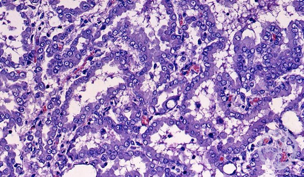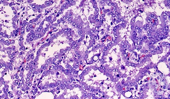 Microscopic view (HE stain, high power view): Mesothelioma cells have round nuclei and eosinophilic cytoplasm. Differentiation from lung adenocarcinoma is sometimes difficult.