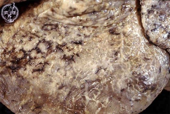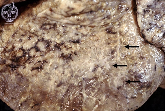 Macroscopic view: Lymphangiosis carcinomatosa. Lymphatics in pleural surface are filled with tumor cells, showing meshy appearance (arrow). Peribronchial lymphatics are filled with tumor cells in rare cases. If bronchial lumen is occluded, sudden death may occur.