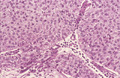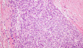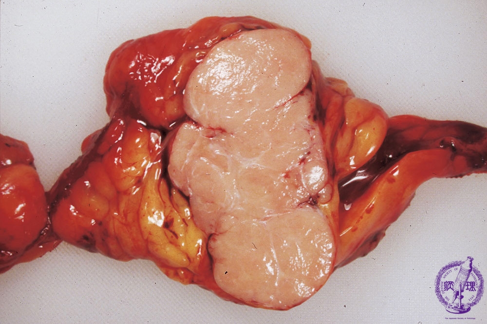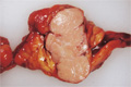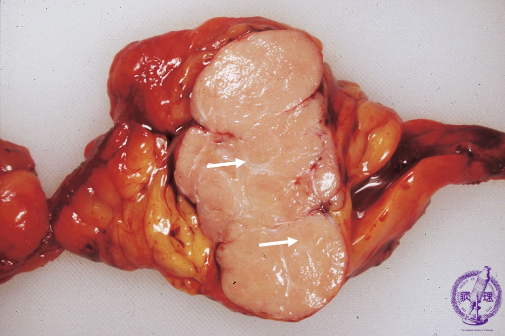 Macroscopic view: Thymoma is in many cases surrounded by a fibrous capsule, and may show various degrees of invasion. Tumor appears solid, expansive and lobulated with thin fibrous septa (arrow).