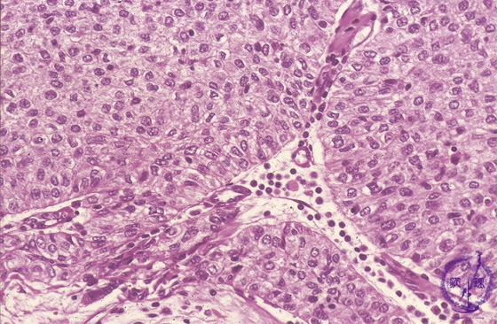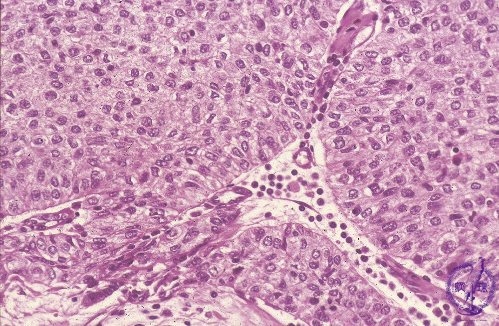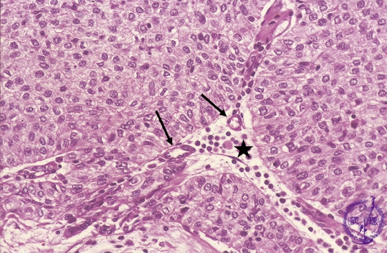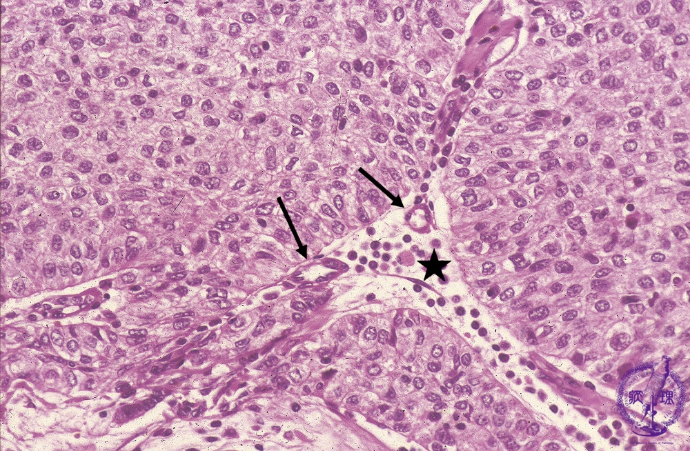 Microscopic view (high power view): Type B3 thymoma (epithelial thymoma) (WHO classification). Large, polygonal epithelial tumor cells grow in sheets without infiltrating lymphocytes. The perivascular spaces (★) seen centrally surrounding small capillaries (arrow) are a finding specific to thymoma.