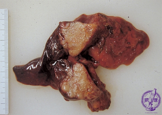 Macroscopic view: Macroscopically, tumor has a lobulated appearance as in thymoma. The tumor circumference is irregular (dotted line), indicating invasion into the surrounding tissue.