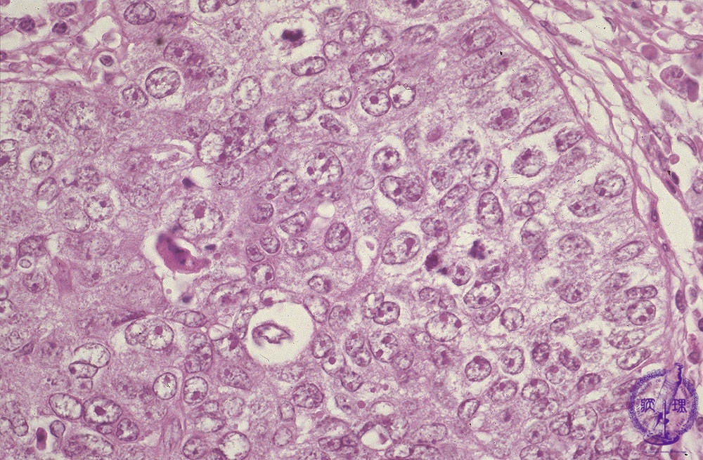 Macroscopic view: Macroscopically, tumor has a lobulated appearance as in thymoma. The tumor circumference is irregular (dotted line), indicating invasion into the surrounding tissue.