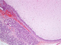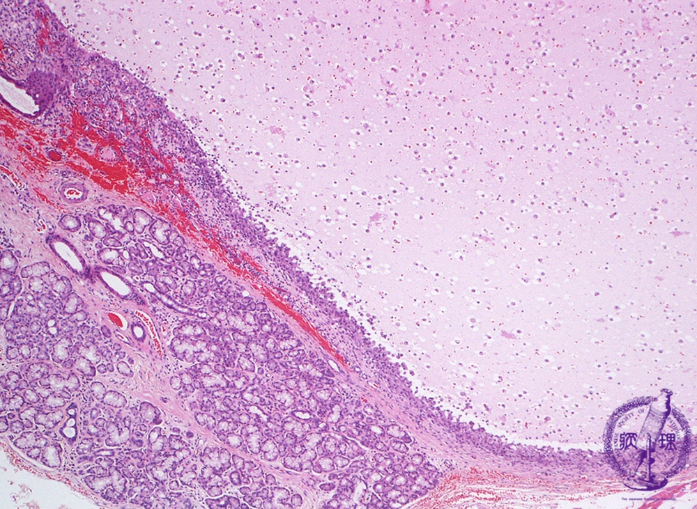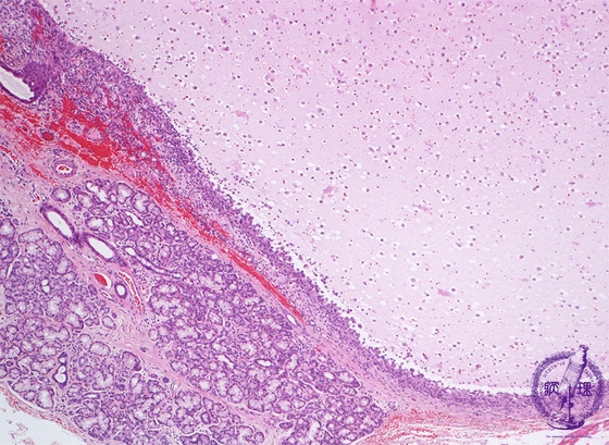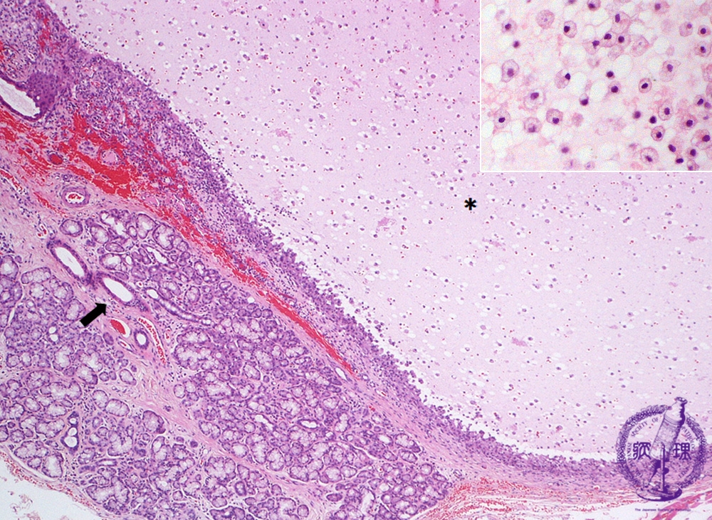 Microscopic finding (HE stain, low-power view) : Adjacent to the minor salivary gland (*), a cyst containing mucoid material and mucophages (mucous laden macrophages) has formed within the granulation tissue (upper right). Ductal dilatation is observed within the salivary gland (arrow).