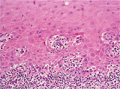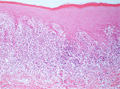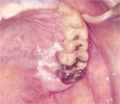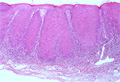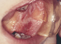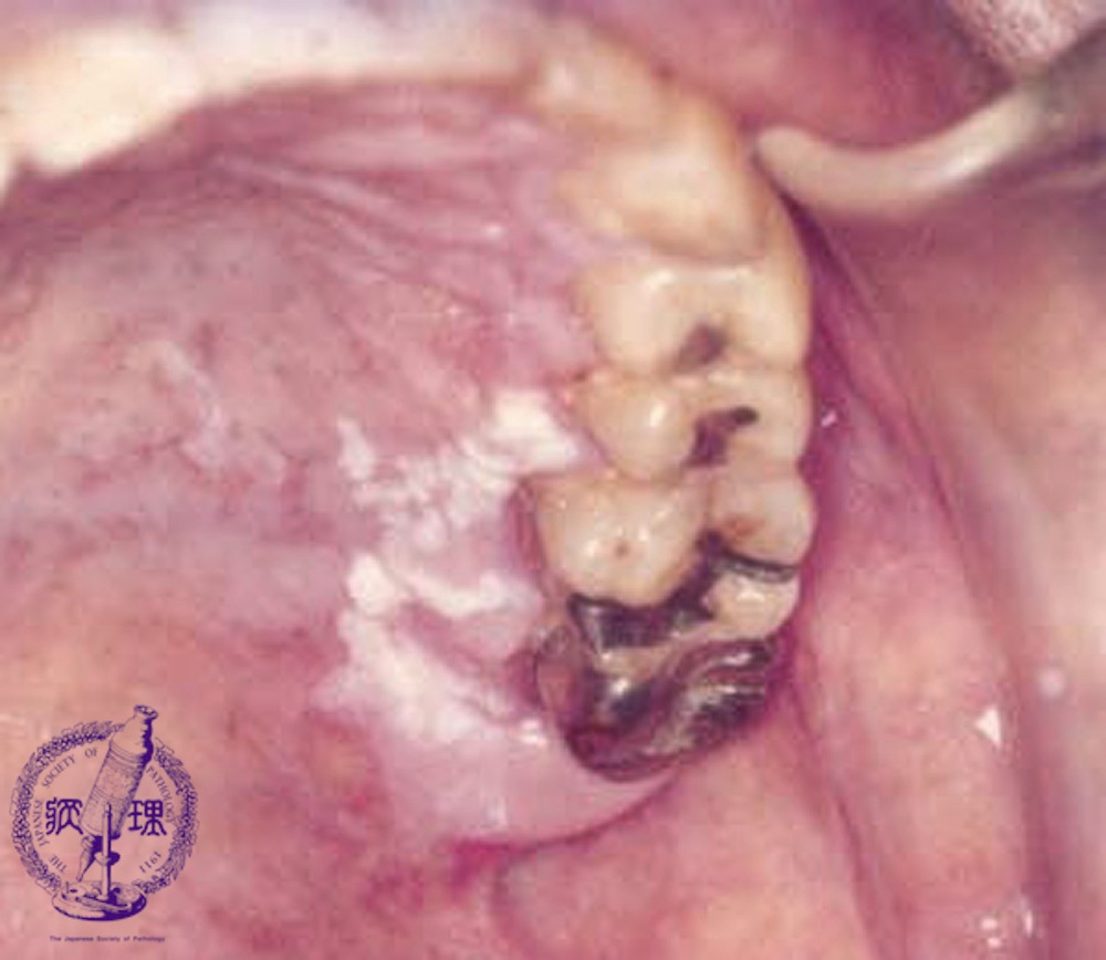 Macroscopic finding:Intraoral photograph. A roughly textured, white lesion spans from the palatal gingiva to the palatal mucosa.