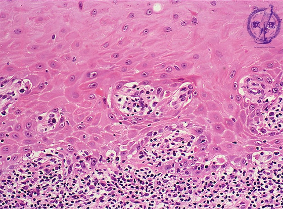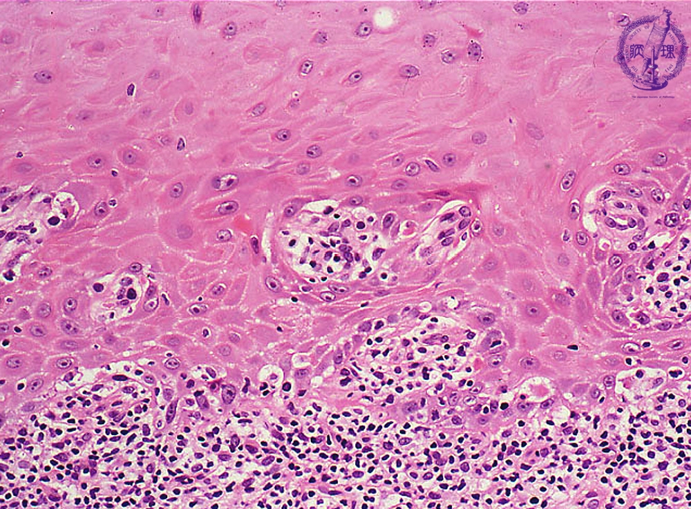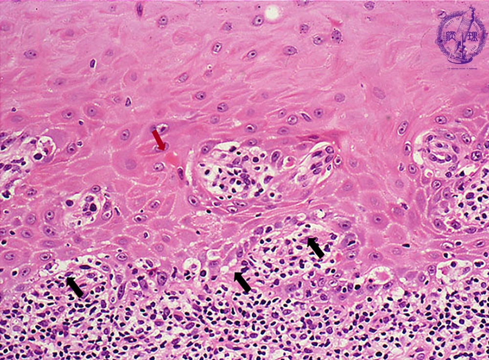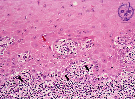 Microscopic finding (HE stain, high-power view):The basal cells show vacuolar change, or hydropic (liquefaction) degeneration (black arrows) and there is cleft formation between the epidermis and papillary dermis. Colloid bodies (degenerating keratinocytes) (red arrow) are seen in the epithelium.