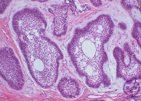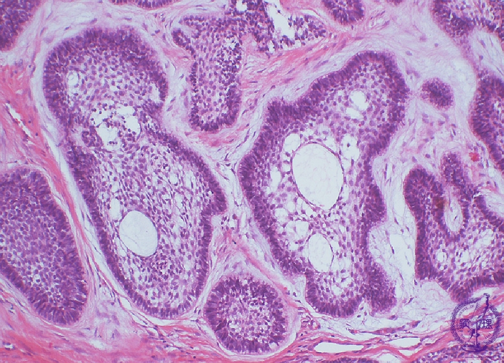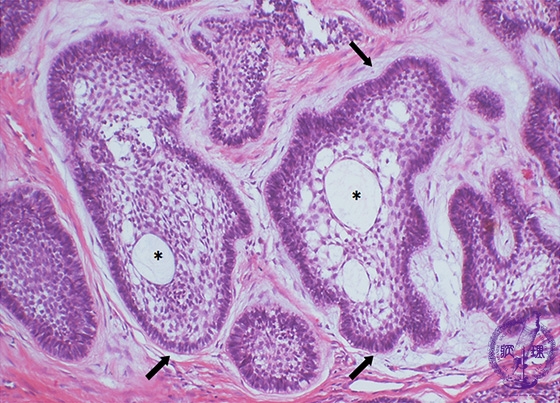 Microscopic finding (HE stain, intermediate-power view):The individual nests consist of two components. In the center are loosely arranged spindle or angular cells resembling stellate reticulum of the enamel organ. In the outer layer are columnar or cuboidal cells with nuclear palisading (arrows). Microcysts are formed within the nests (parenchymal cyst*) (follicular type)