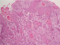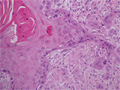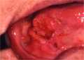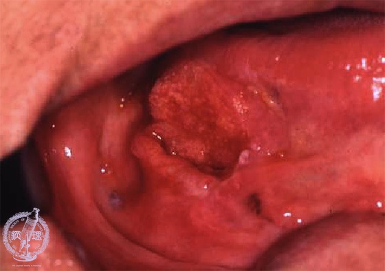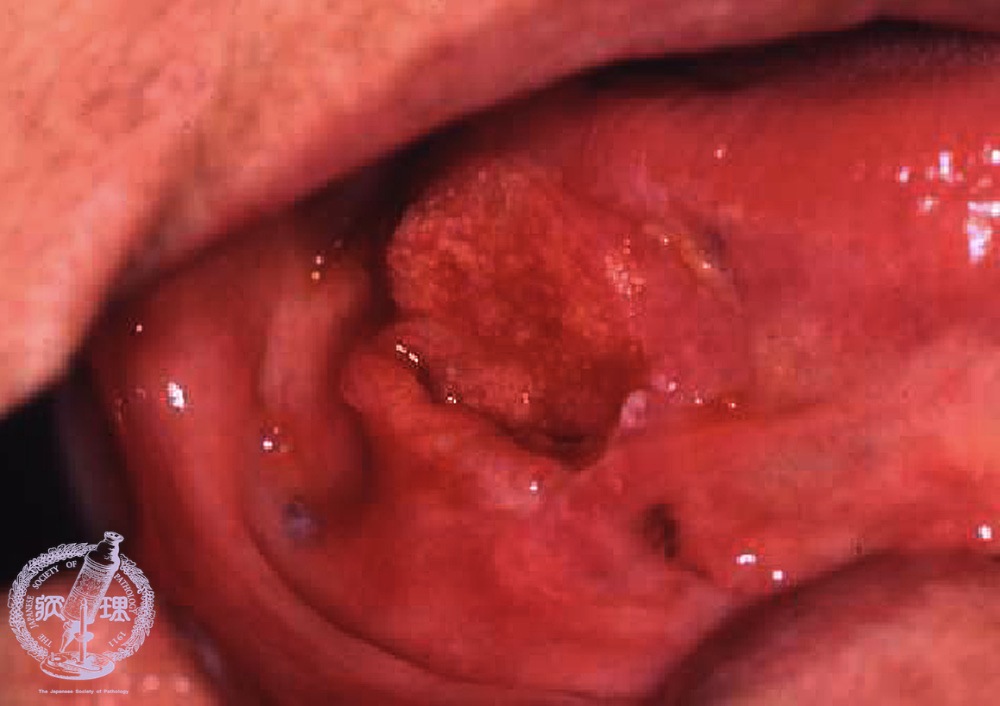Intraoral photograph. An exophytic lesion with fine granular and ulcerated surface. Change extends from the tongue lateral edge to floor of the mouth.