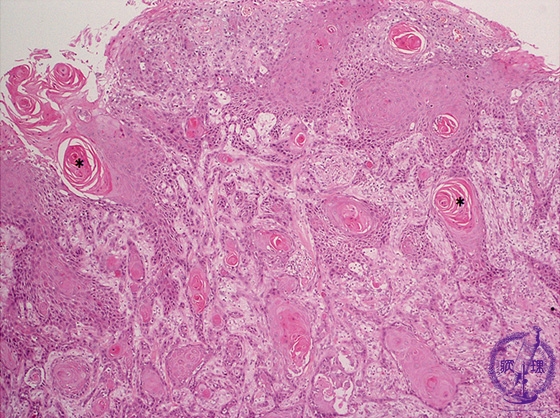 Microscopic finding (HE stain, low-power view): Squamous cell carcinoma nests infiltrate from the surface to the deep margin of the specimen. Tumor nests contain keratin pearls (*).