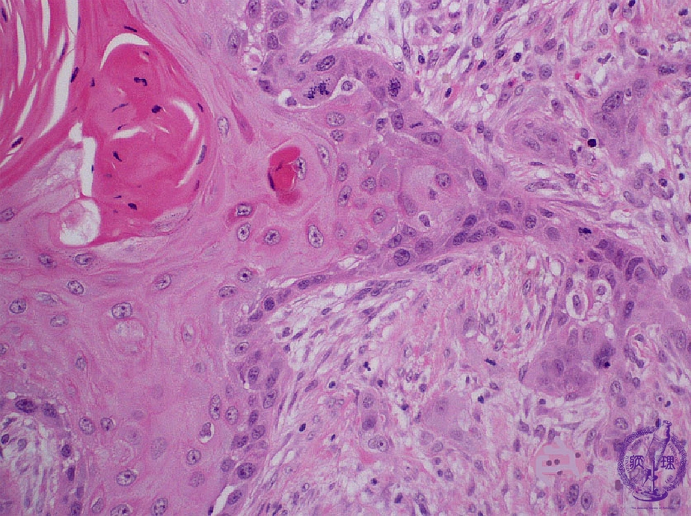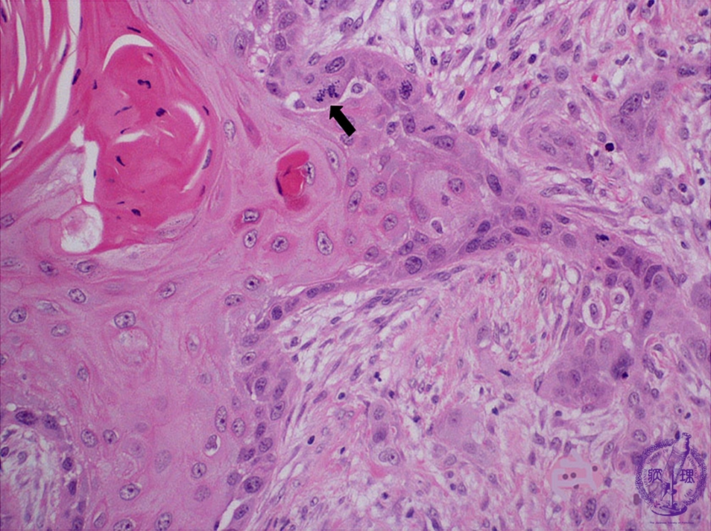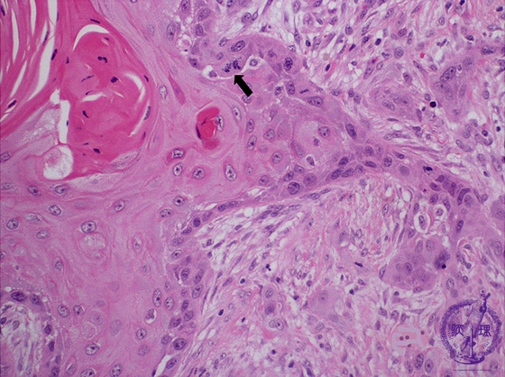 Microscopic finding (HE stain, high-power view):Despite exhibiting keratinization and recognizable stratified squamous cell epithelium architecture, there are characteristic features of cancer such as nuclear pleomorphism and atypical mitoses (arrow).
