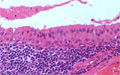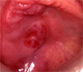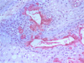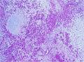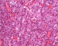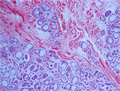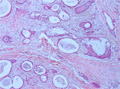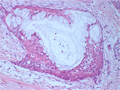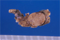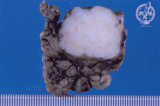 Macroscopic finding:A well-demarcated solid tumor lies in the parotid gland. The cut surface of this tumor is yellowish-white with focal glistening areas. The glistening areas correspond to abundant myxomatous or chondroid stroma.