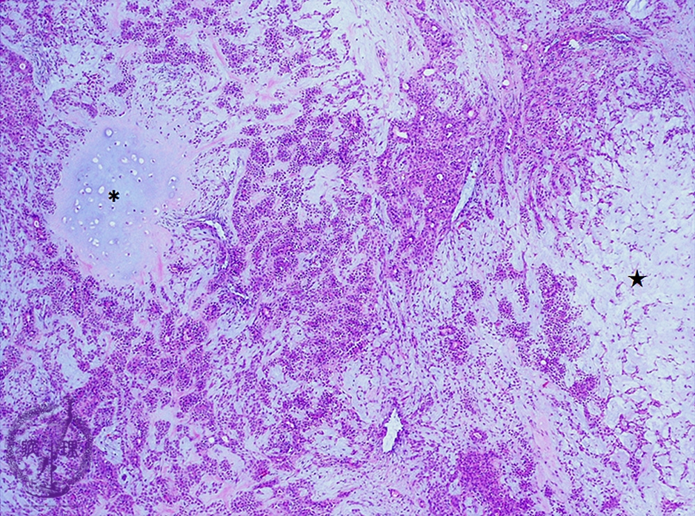 Microscopic finding (HE stain, low-power view):Pleomorphic adenoma shows divergent morphological features. There are tubular and trabecular structures composed of epithelial cells with an intermingled myxomatous (★) and chondroid stroma (*).