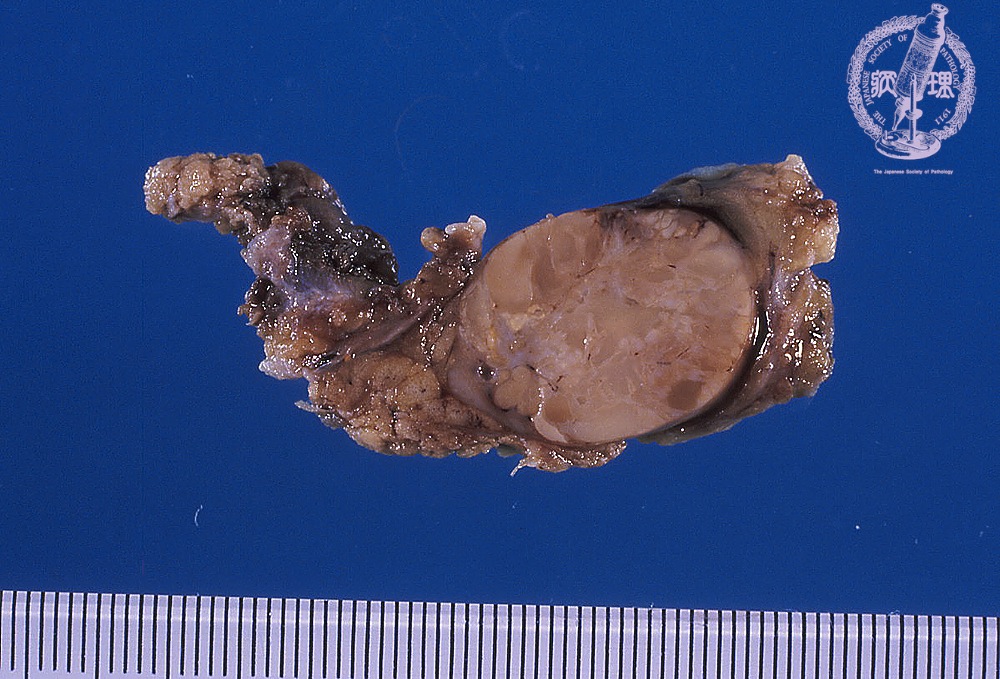 Macroscopic finding:A well-demarcated tumor in the parotid gland. The cut surface of the tumor is tan in color.
