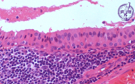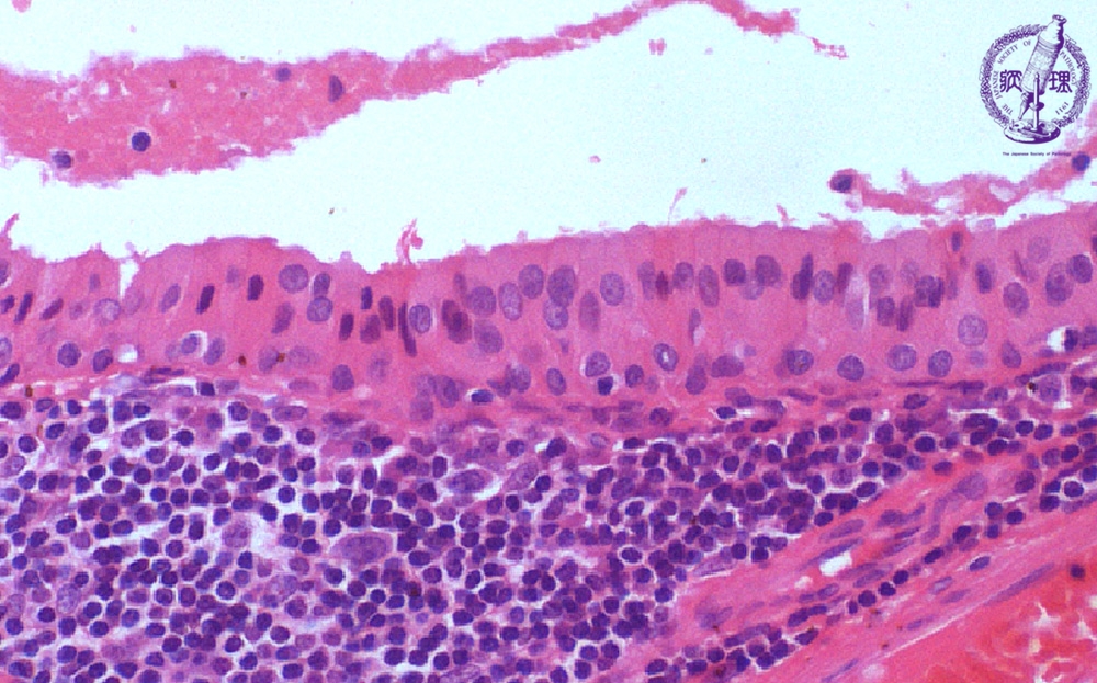 Microscopic finding (HE stain, high-power view):The tumor cells lining the cyst are oncocytic due to cytoplasmic eosinophilic granules. These cells have a dual-layered arrangement with inner tall columnar cells and outer cuboidal cells. The stroma (area below the dotted line) is composed of lymphoid tissue.