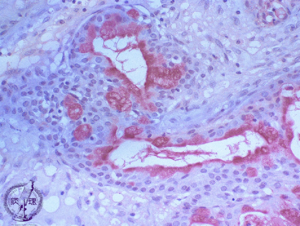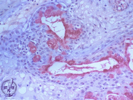 Microscopic finding (Mucicarmine stain, high-power view):Mucus producing cells and lumenal contents are stained red by mucicarmine stain (stain for epithelial mucin).