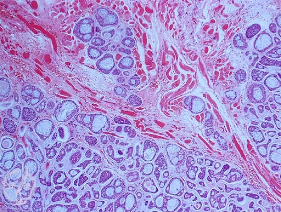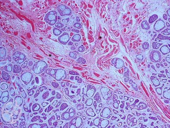 Microscopic finding (HE stain, low-power view):Cribriform and tubular nests infiltrate into the muscle (*).