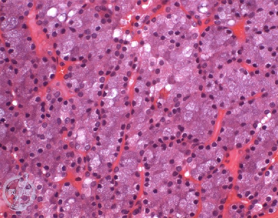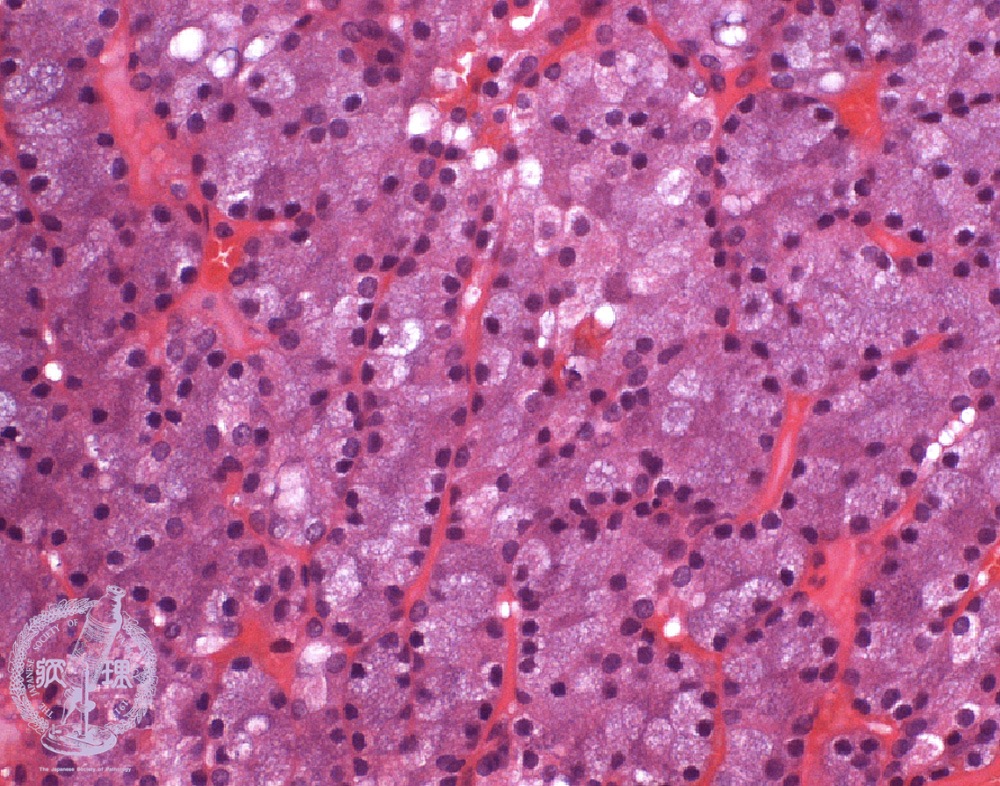 Microscopic finding (HE stain, intermediate-power view):The tumor cells with basophilic granular cytoplasm resembling normal serous acinar cells, proliferate in solid and trabecular growth patterns. The nuclei are basilar (close to the stroma). Cellular atypia and mitoses are infrequent.