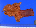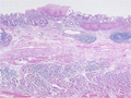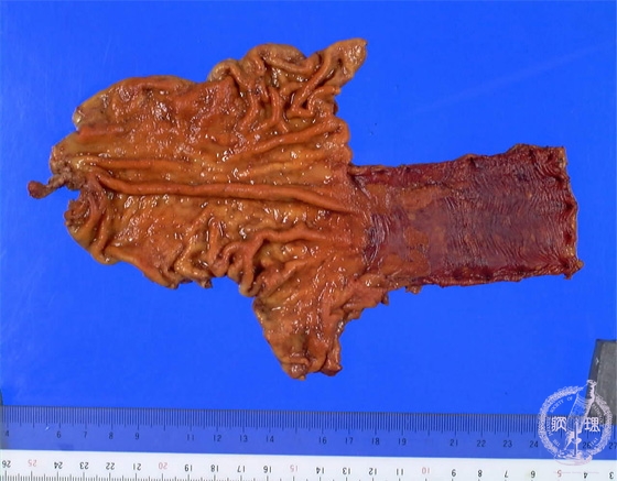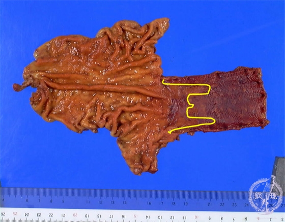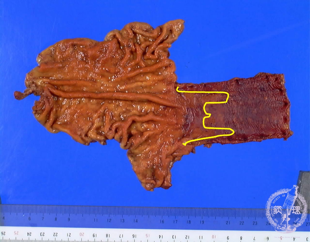 Gross appearance: Adenocarcinoma arising in Barrett esophagus. Barrett esophagus is defined as replacement of the normal stratified squamous epithelium with intestinal metaplasia.