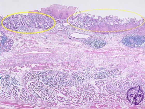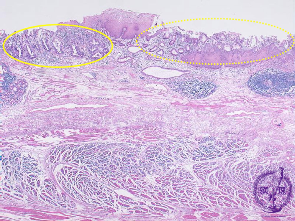 Microscopic view (H&E stain, low power): Barrett esophagus (right, dotted line) and adenocarcinoma (left, solid line)