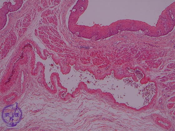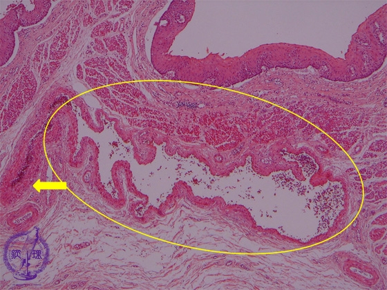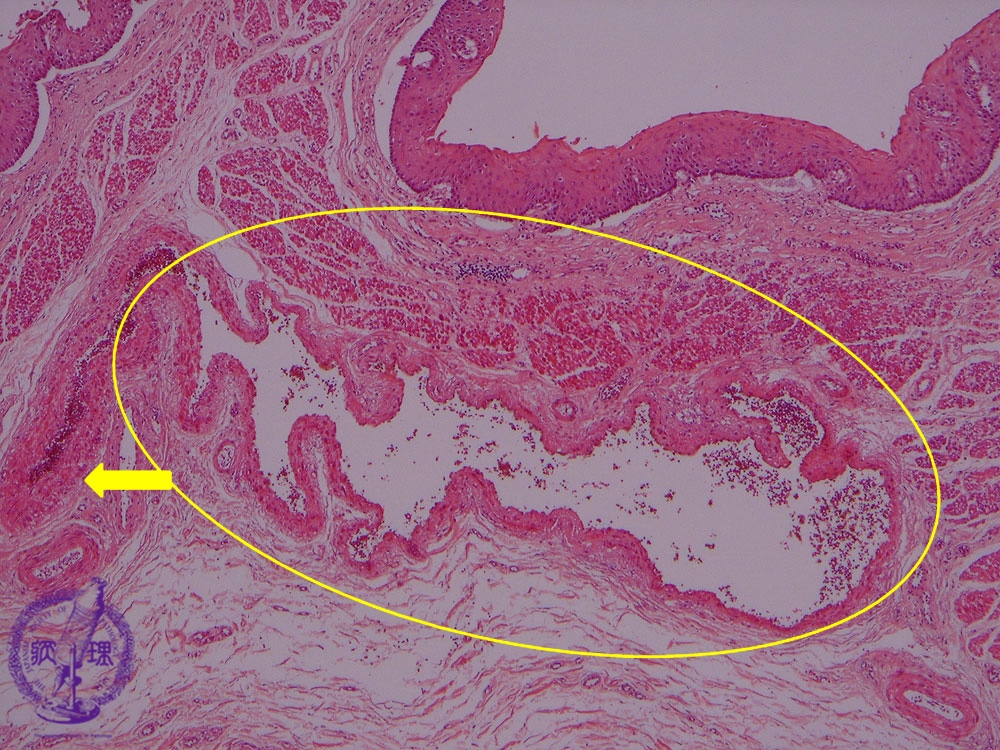 Microscopic view (H&E stain, low power): Esophageal submucosal veins are strikingly dilated (circle) and their walls are thickened (arrow).