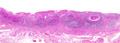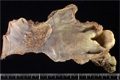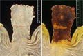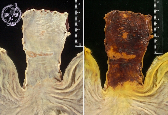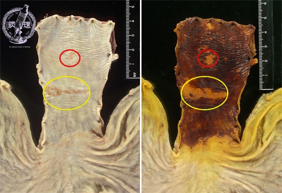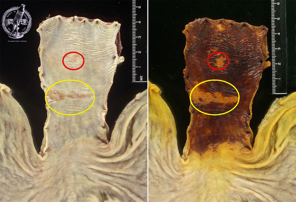 Gross appearance: At the mid esophagus, there is a 3x1cm brownish flat lesion (yellow circle). There are similar, smaller lesions which are scattered more proximally (red circle, at left of image). The lesions are made more conspicuous by their lack of iodine staining (at right).