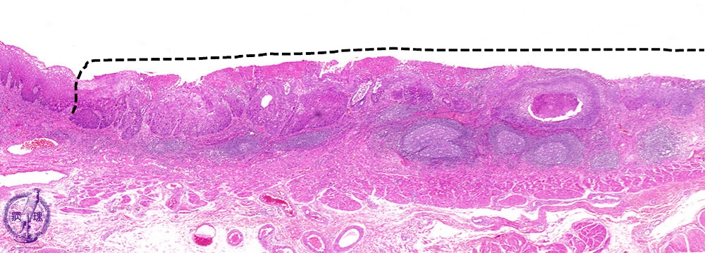 Microscopic view (H&E stain, low power): Esophageal squamous cell carcinoma (early carcinoma). An example of intramuoscal carcinoma (dotted line).