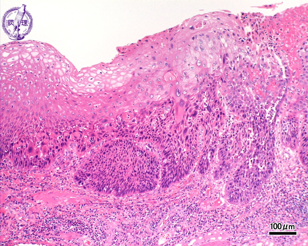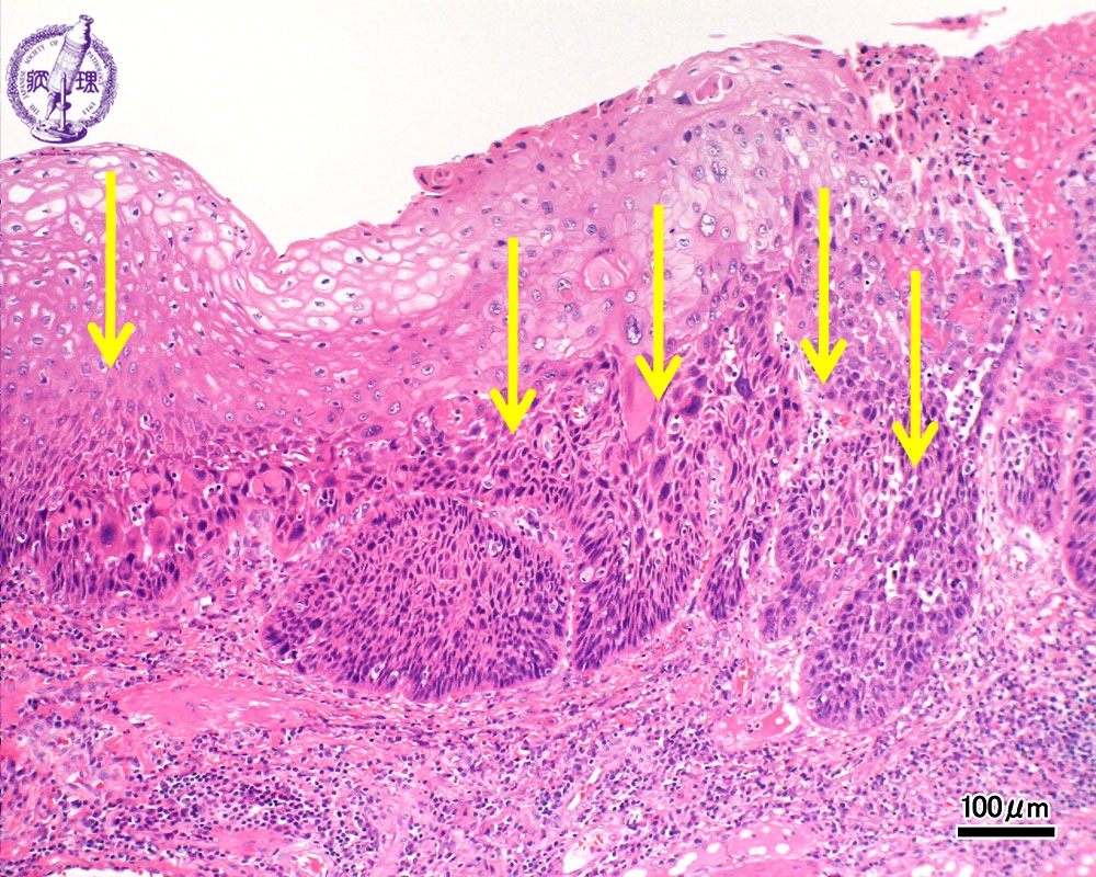 Microscopic view (H&E stain, intermediate power): The basilar epithelium is occupied by atypical cells which show expansive invasion into the lamina propria (squamous cell carcinoma, arrow).
