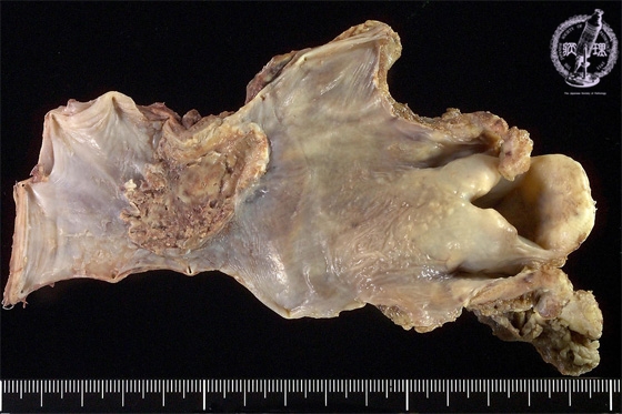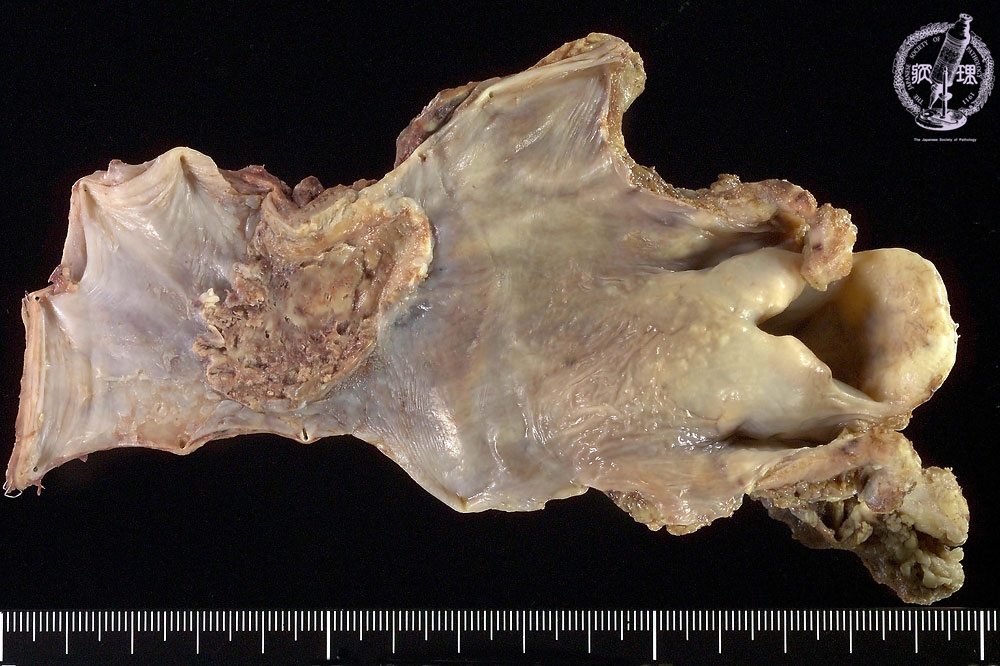 Gross appearance: There is advanced and ulcerating carcinoma which is localized and measures 4 cm in greatest dimension.