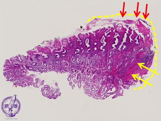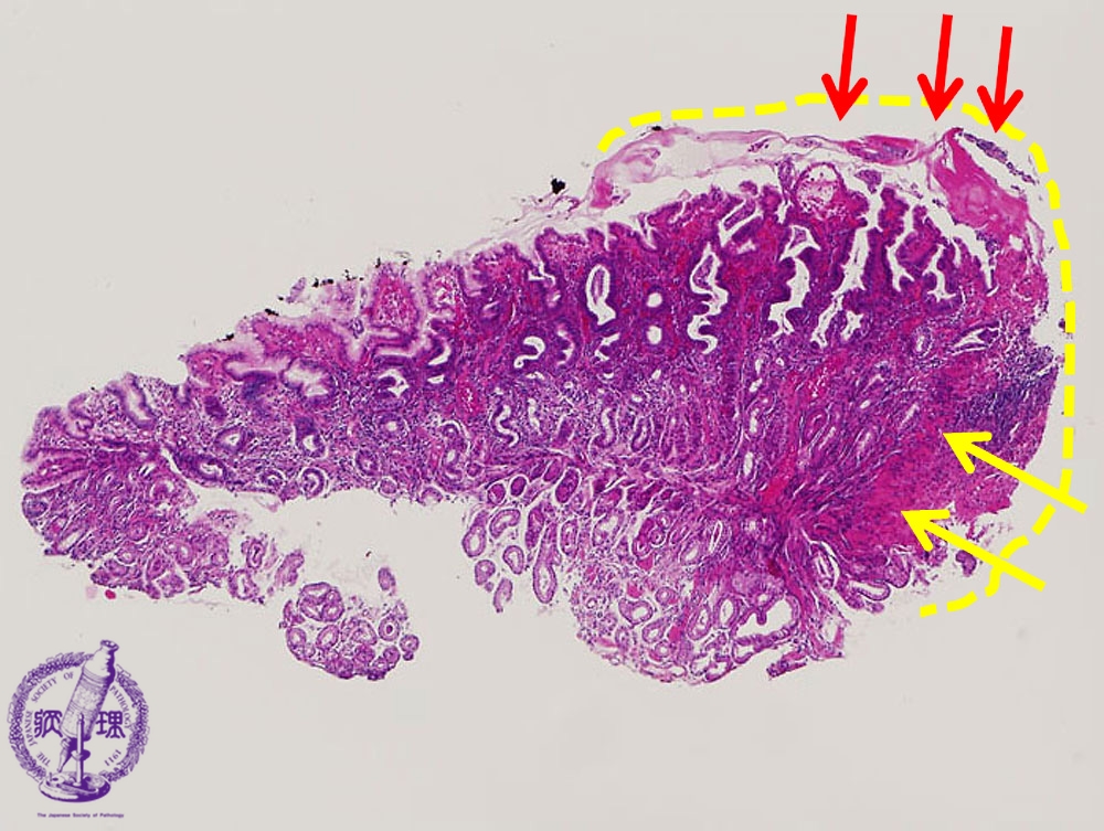 Microscopic view of acute gastric mucosal lesions (H&E stain, low power): At the right edge, there is an erosive area (yellow dashed line) which exhibits intramuoscal hemorrhage and adherent fibrin at the surface. These findings are frequently observed in AGML.