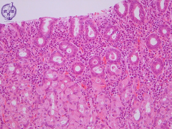 Microscopic view (H&E stain, intermediate power): Chronic gastritis. The surface epithelium shows chronic, predominantly lymphoplasmacytic inflammation while foveolar crypts show regenerative change.