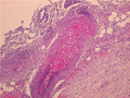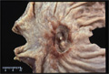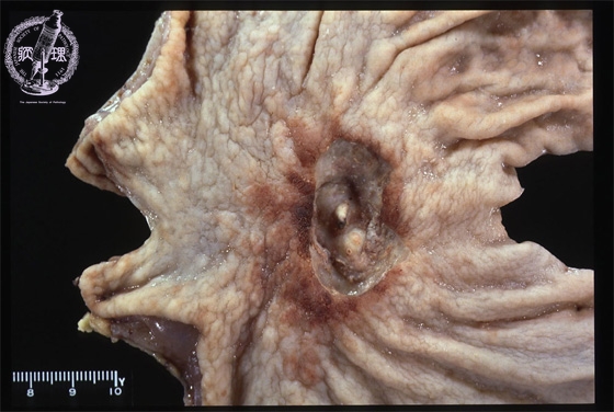 Gross appearance: An 35 x 20 mm, excavated peptic ulcer in the lesser curvature (open circle). Its oval appearance with focal gastric folds is suggestive of a recurrent lesion. The ulcer edge is edematous but not irregular. Necrotic debris and exposed vessels are seen at the ulcer base (arrow).