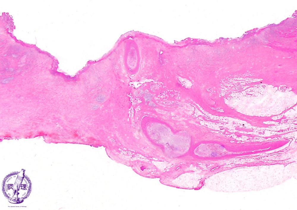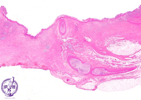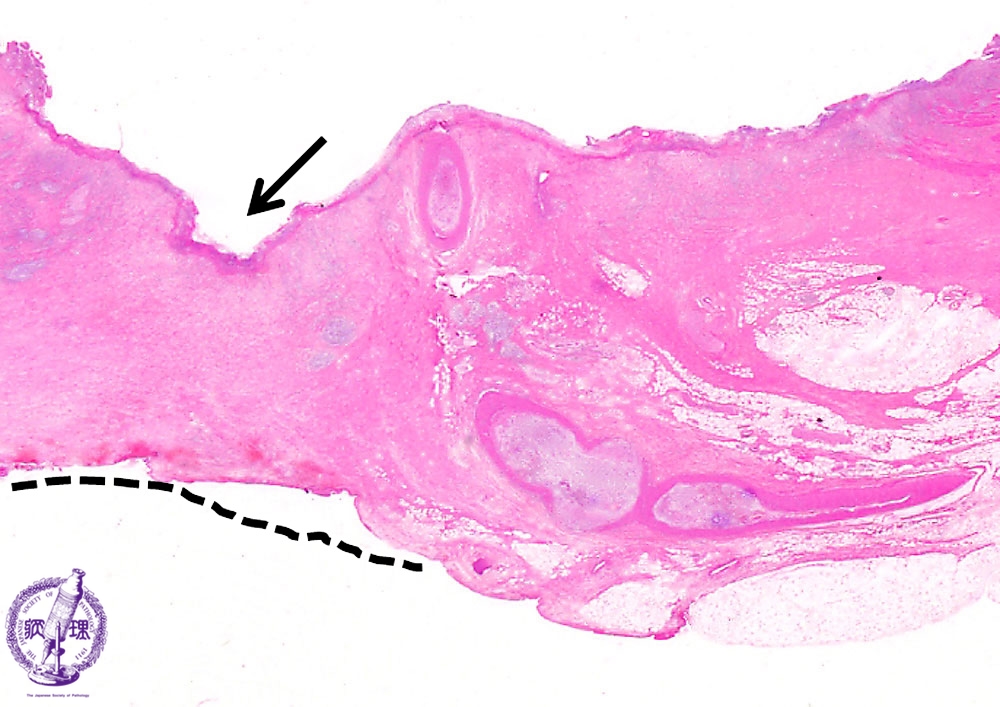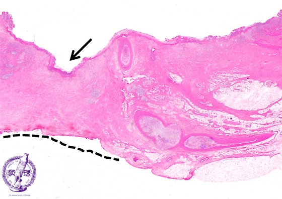Microscopic view (H&E stain, low power): The active ulcer penetrates into the serosa with serositis (dashed line). Within granulation tissue at the surface, an exposed artery (arrow) is observed.