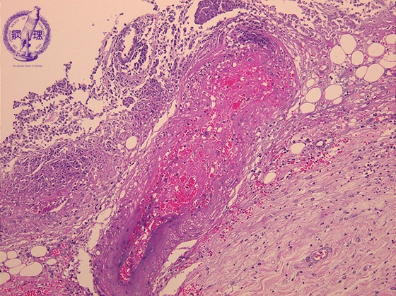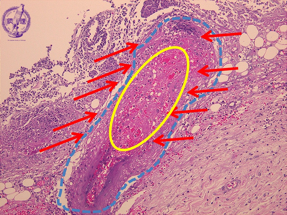Microscopic view (H&E stain, high power): Blood vessels (blue) within the ulcer bed are necrotic (arrow) and contain post-hemorrhagic organizing thrombus (yellow).