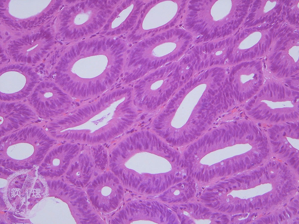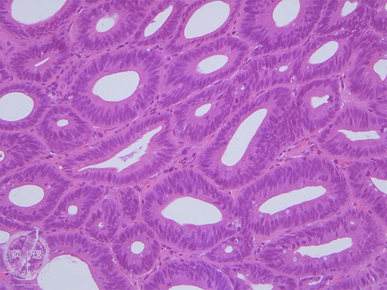 Microscopic view (H&E stain, medium power): The glandular epithelium shows changes similar to those in tubular adenoma.