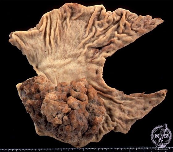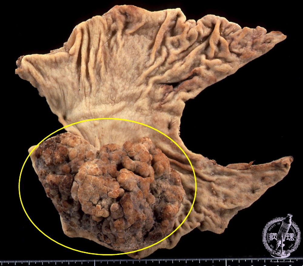 Gross appearance: Advanced gastric cancer (type 1, polypoid lesion), measuring 115 x 85 x 50 mm and arising in the lower, posterior wall with invasion into muscularis propria. The lesion’s surface is clearly uneven and irregular.