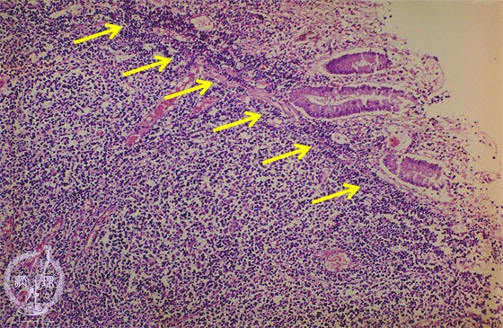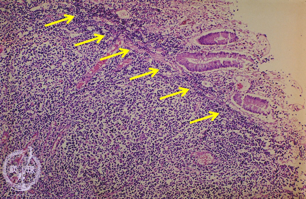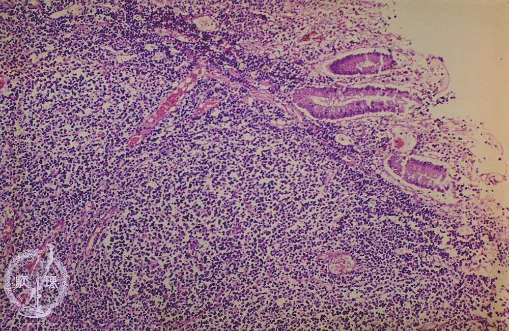 Microscopic view (H&E stain, intermediate power): The mucosa is displaced due to proliferation of atypical lymphocytes.