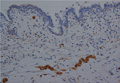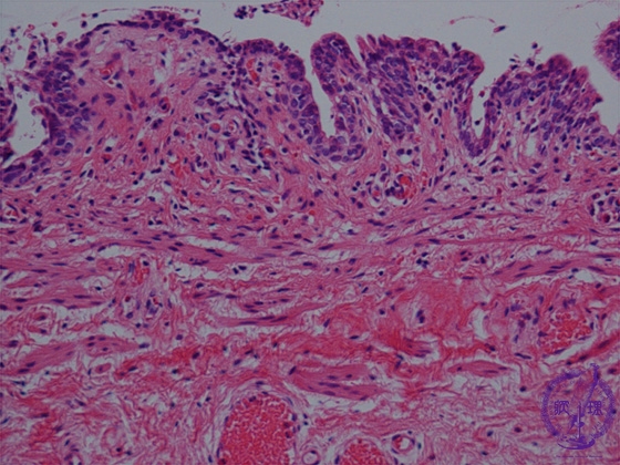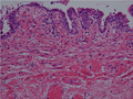 Microscopic view: While nerve fibers are present (arrows), ganglion cells are not.