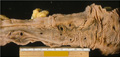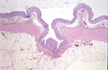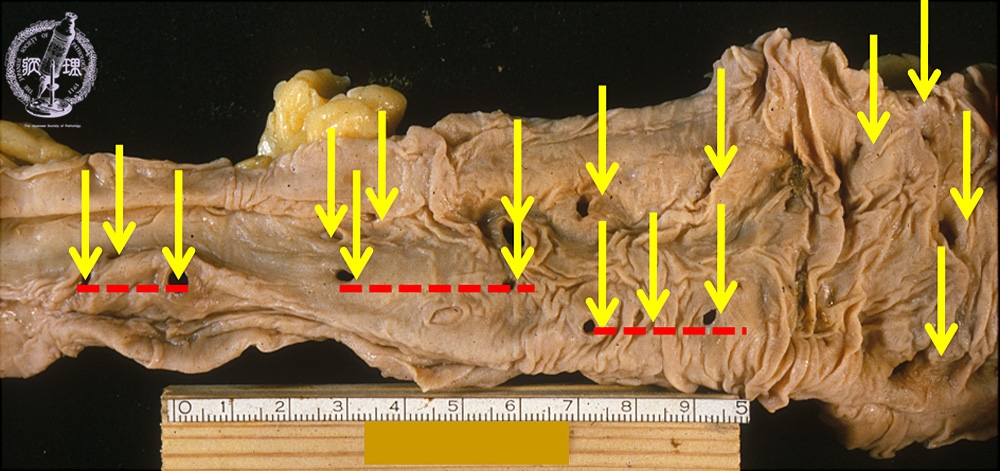 Gross appearance: The large bowel mucosa has multiple openings which are aligned lengthwise, in areas away from taenia coli.