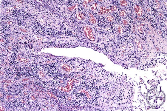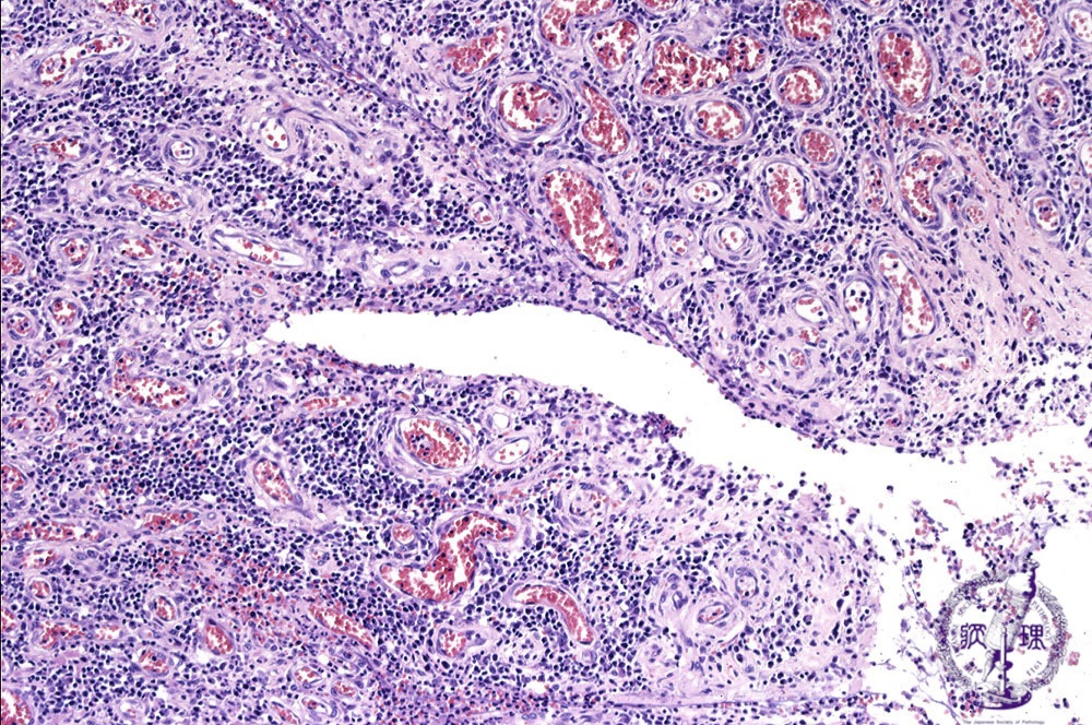 Microscopic view (H&E stain, medium power): Fissure formation is seen.