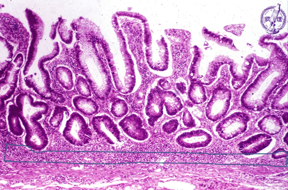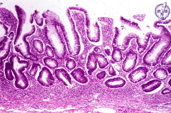 Microscopic view (H&E stain, intermediate power): Chronic ulcerative colitis shows dissociation of the epithelium from the muscularis mucosa, irregularly branched glands and decreased goblet cells.