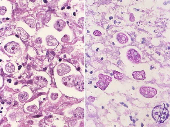 Microscopic view (high power, left: H&E stain, right: PAS stain): Cystic amoeba trophozoites are present. The parasites are PAS stain positive.