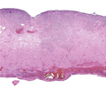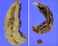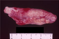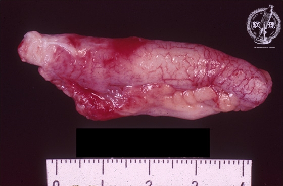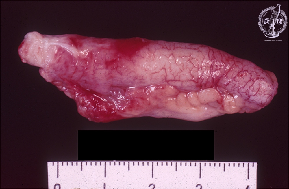 Gross appearance (unfixed specimen): The appendix is swollen and red due to hemorrhage.