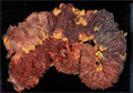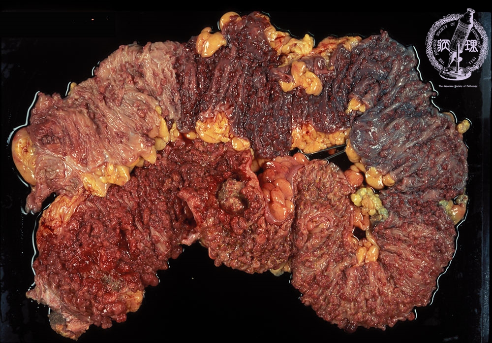 Gross appearance: This case of adenomatous polyposis with innumerable polyps is complicated by carcinoma. At the image center, Borrmann type 2 invasive carcinoma is observed.