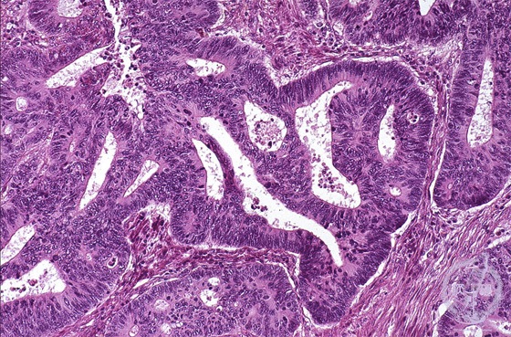 Microscopic view (H&E stain, medium power): Tubular adenocarcinoma is composed of small to medium sized tubules as well as cribriform growth (moderately differentiated).