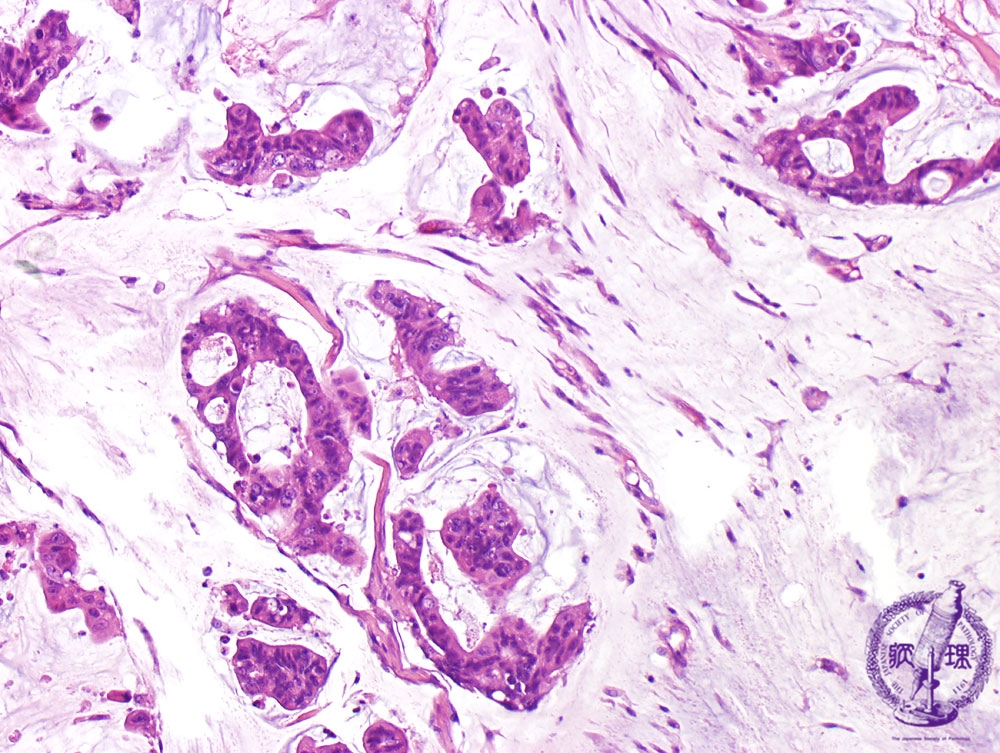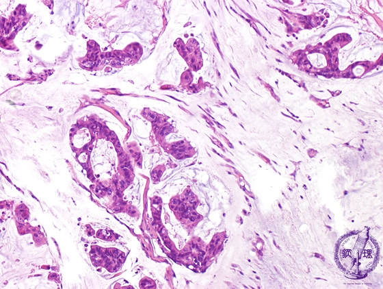 Microscopic view (H&E stain, medium power): Mucinous adenocarcinoma is composed of tumor cells arranged in trabecular and cribriform patterns and floating in extracellular mucin.