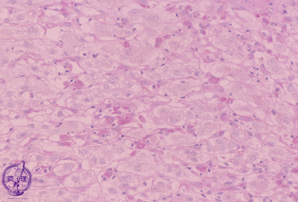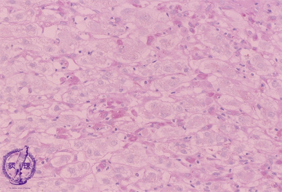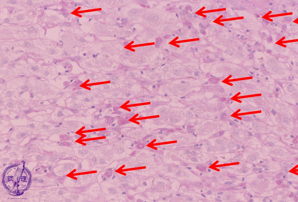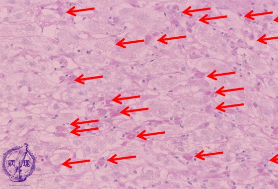 Microscopic image (PAS diastase stain, high power): Within sinusoids, numerous diastase resistant PAS positive histiocytes (Kupffer cells) are seen. These changes are observed in association with acute liver injury.