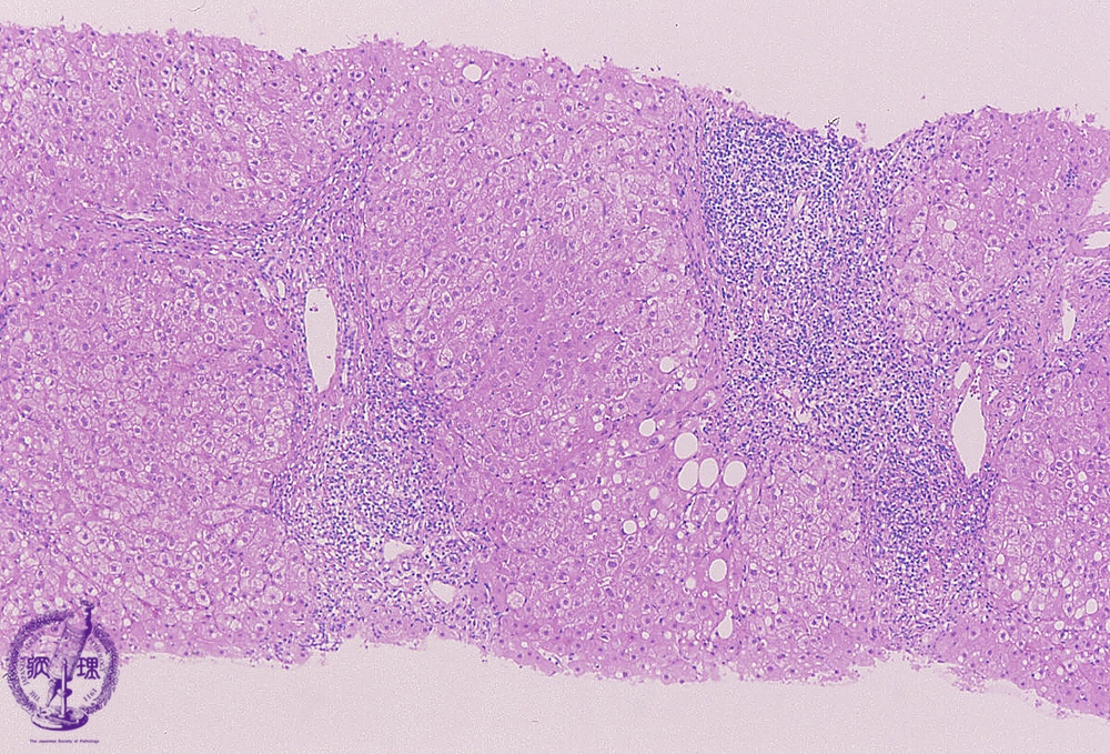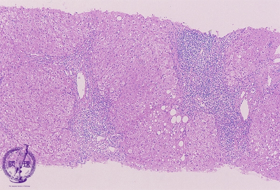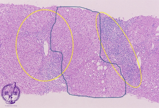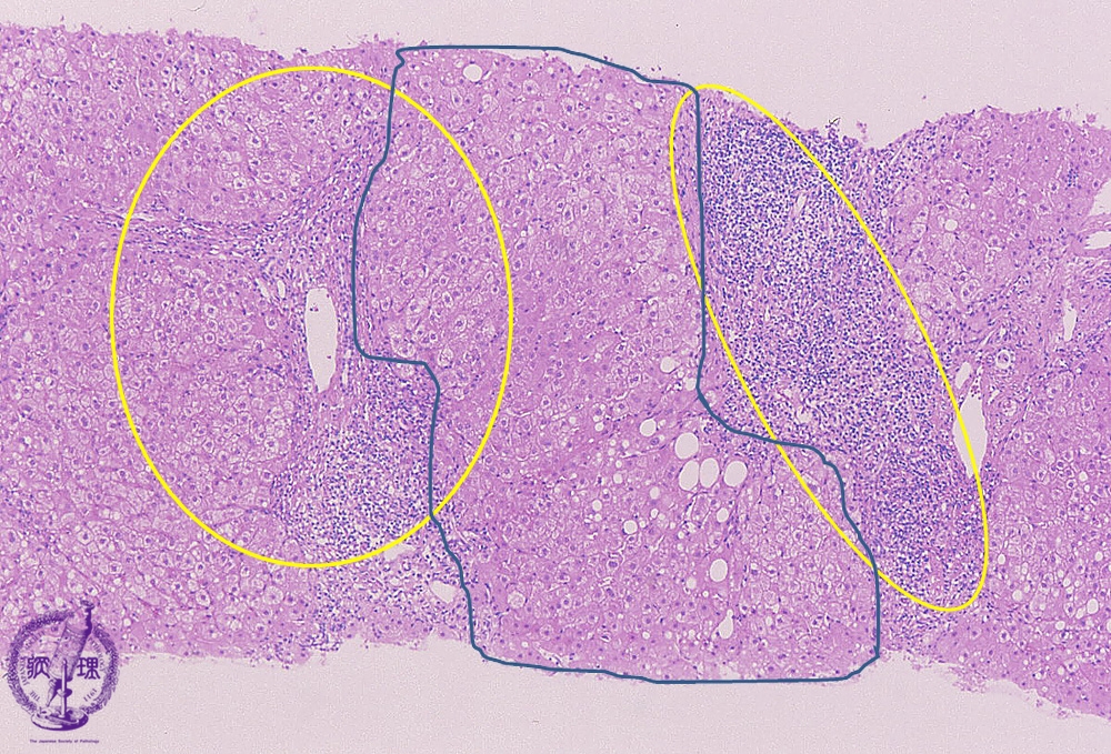Microscopic image (HE stain, low power view): There is a dense lymphocytic infiltrate with corresponding moderate to marked portal expansion (yellow circle). Fibrosis (blue line) is also seen, and results in disruption of the lobular architecture with segregation of lobules which imparts a nodular appearance in some areas (blue area).