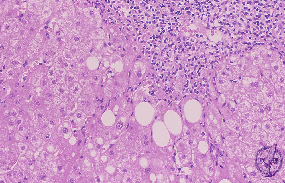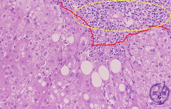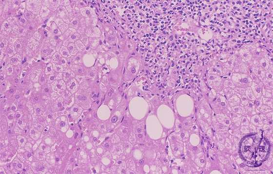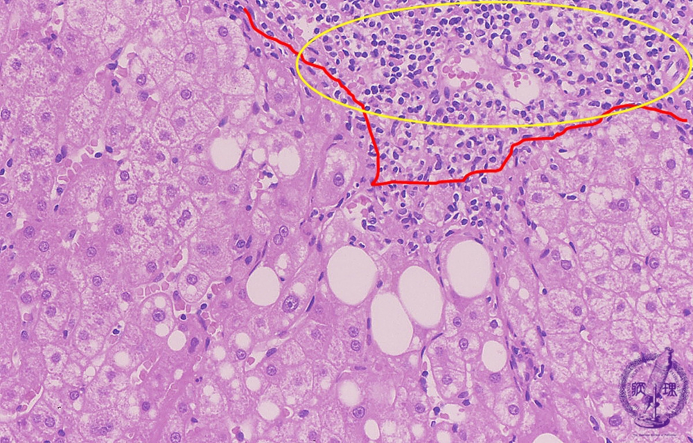 Microscopic image (HE stain, high power view): There is dense portal chronic inflammation with interface hepatitis comprising lymphocytic inflammation at the limiting plate and concurrent hepatocellular drop-out (yellow box). Hepatocytes contain large cytoplasmic lipid droplets (steatosis).