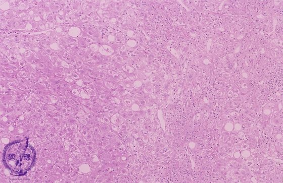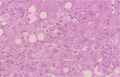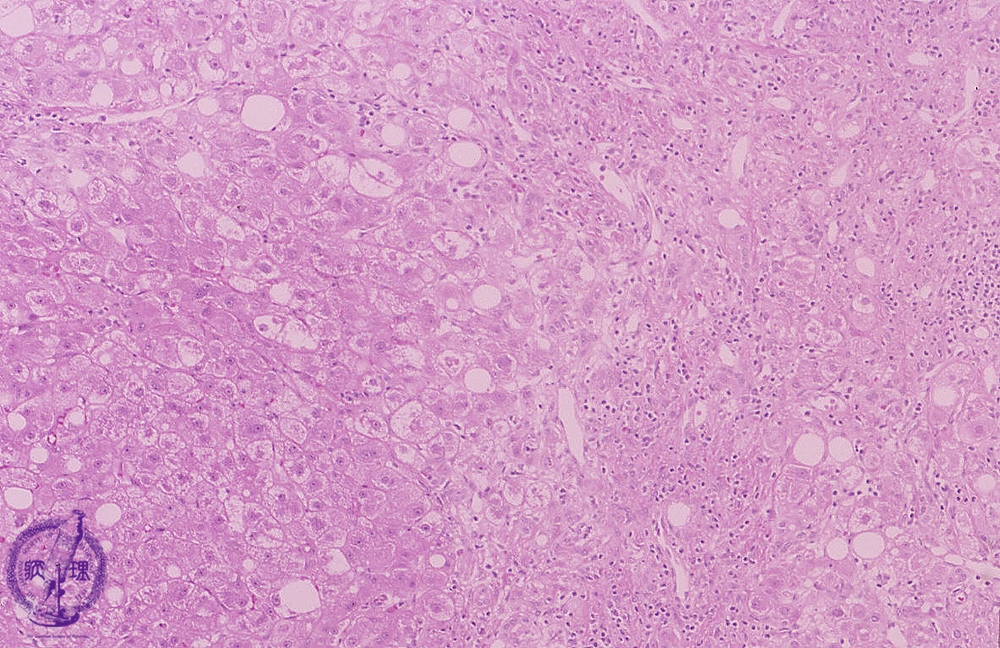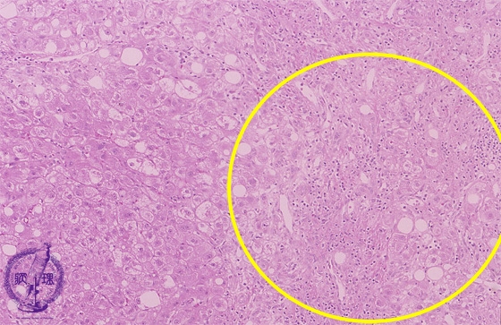 Microscopic image (HE stain, low power): There is hepatocellular balloon cell degeneration, steatosis and centrilobular perisinusoidal fibrosis (yellow box, lower right). Mild inflammatory infiltrates are seen.