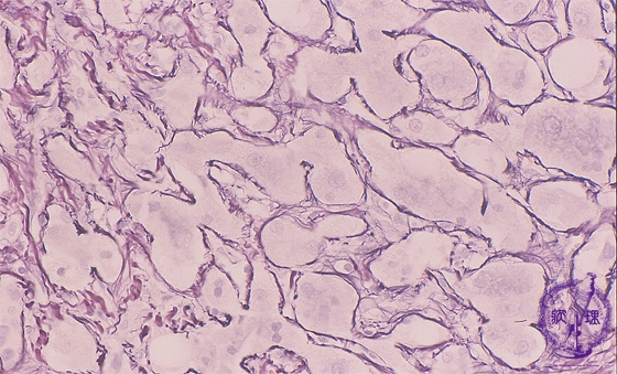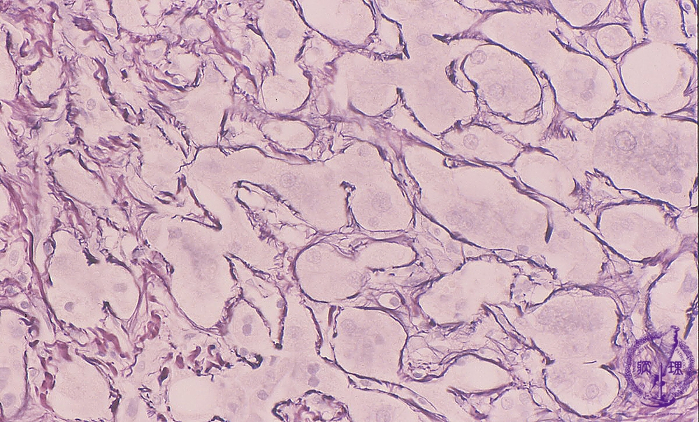 Microscopic image (silver stain, high power): Hepatocytes show distinct centrilobular perisinusoidal fibrosis, consistent with alcoholic steatohepatitis. The hepatocellular architecture is distorted.
