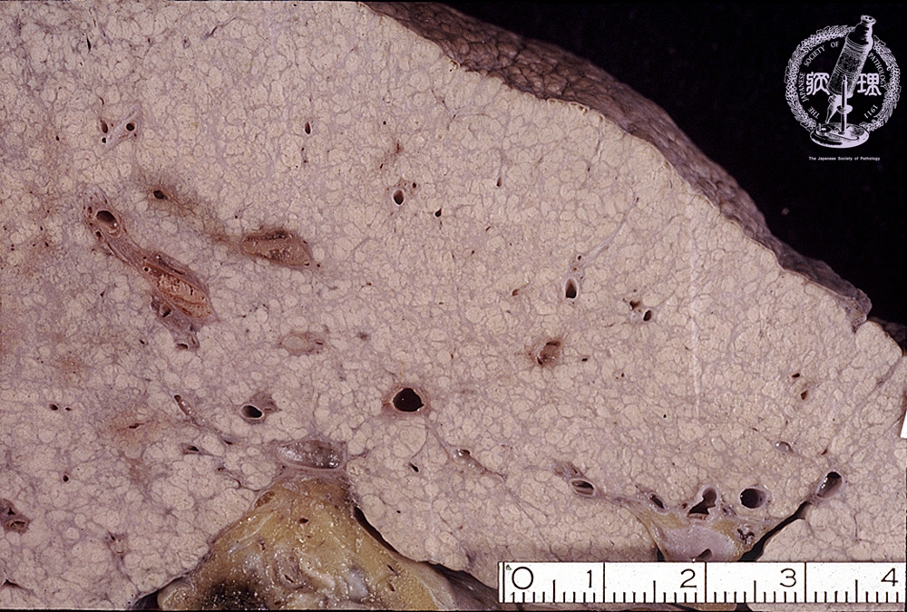 Macroscopic image: Small relatively uniformly sized nodules are separated by thin fibrotic septae.